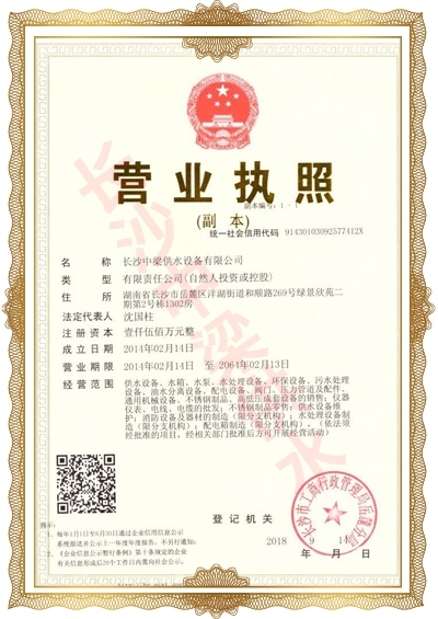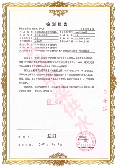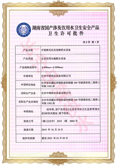 長沙中梁供水設備有限公司已先后通過湖南省衛生廳國產涉及飲用水衛生產品衛生許可批準;