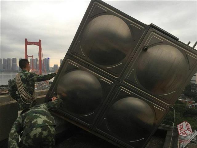 因該小區目前沒有入住,一樓大門無法開啟,救援人員從二樓的窗戶爬進,并徒步至12樓樓頂。“情況特別危險,隨時都有可能掉下來。”救援人員江愛華介紹,新一輪暴雨又要降下,必須趕在大雨之前消除隱患。大家用繩子小心翼翼地將水箱捆住,然后奮力往樓頂的中間區域拉,經過3小時的緊張奮戰,水箱被復位,為防止再出意外,大家又對水箱箱體進行加固。